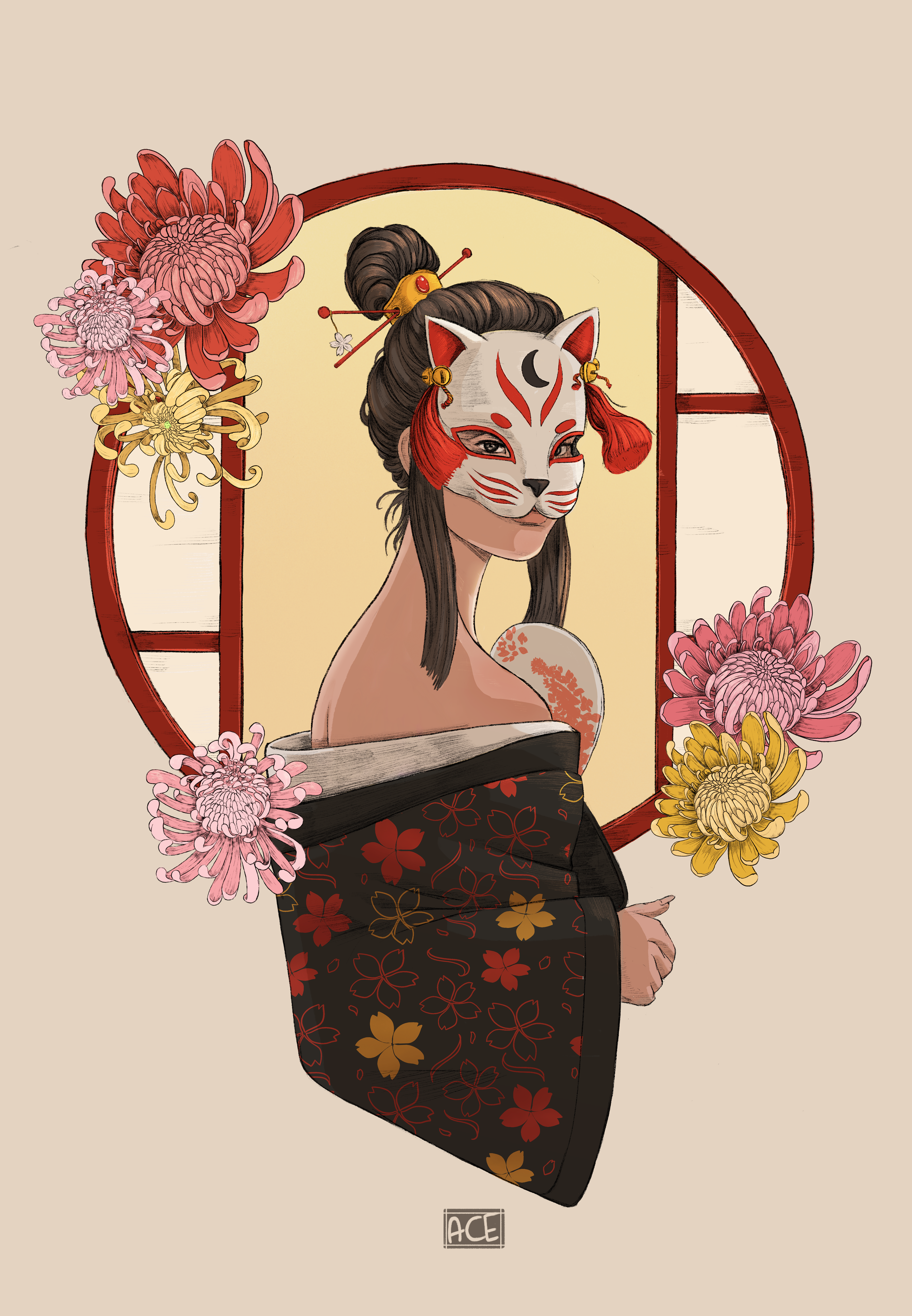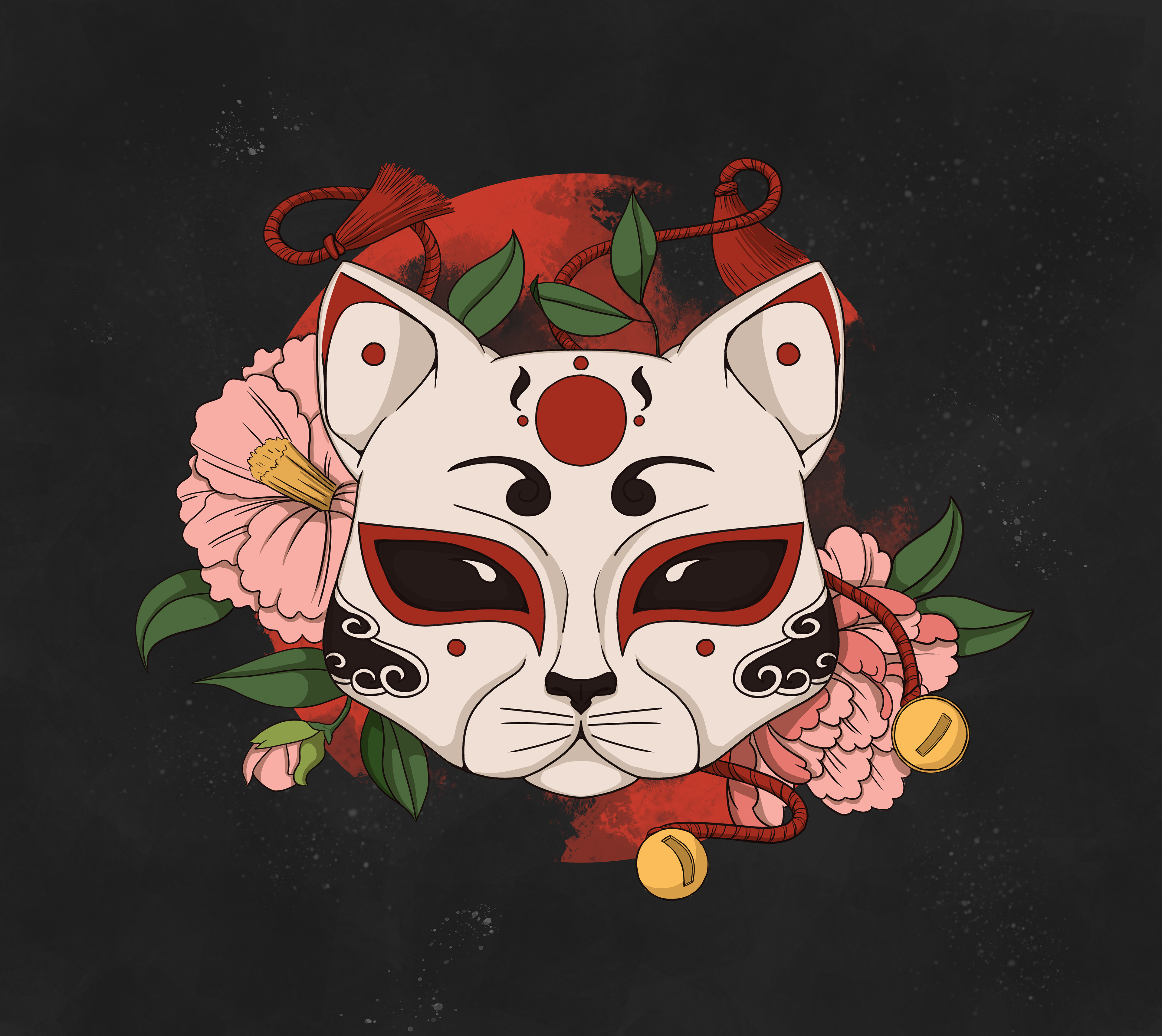 A woman with a Japanese cat mask surrounded by flowers. My fascination with Japanese culture often leads me to create illustrations that incorporate it's elements. In this case, the focus is mainly on the mask, which can frequently be found in various forms at festivals or shops near shrine grounds.